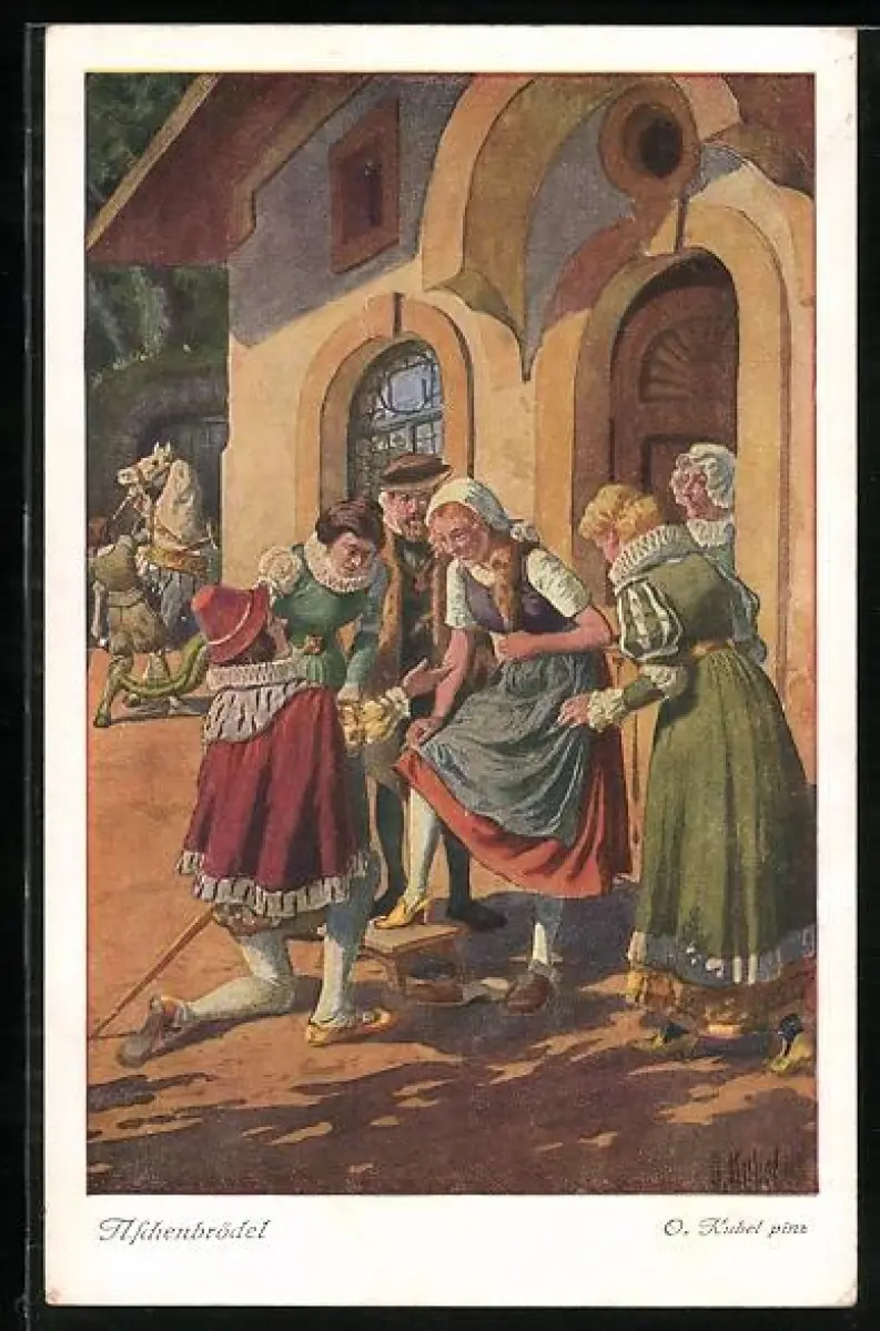 Künstler-AK Otto Kubel: Aschenputtel, Prinz sucht die Besitzerin des verlorenen Schuhs