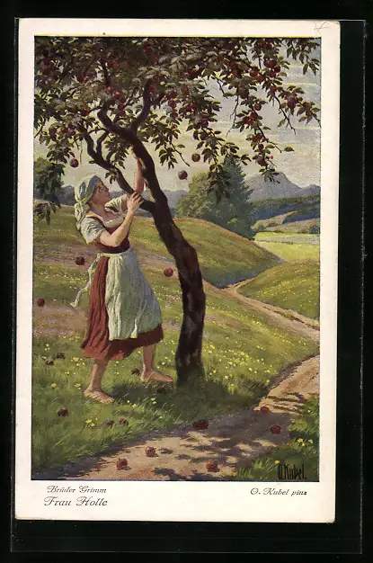 Künstler-AK Otto Kubel: Brüder Grimm's Märchen: Frau Holle, Goldmarie am Apfelbaum