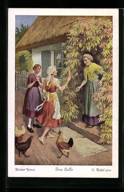 Künstler-AK Otto Kubel: Brüder Grimm's Märchen: Frau Holle, vor Stiefmutters Haus