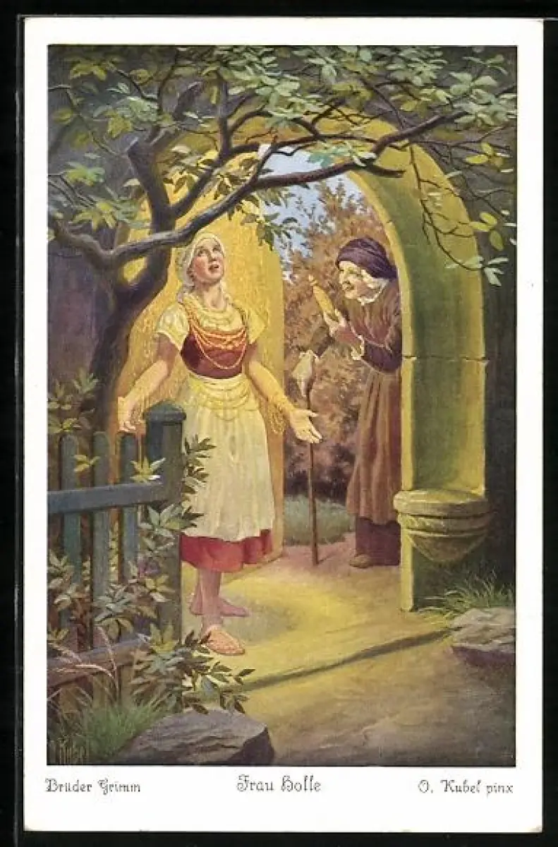 Künstler-AK Otto Kubel: Frau Holle, Das Mädchen wird mit Gold beschenkt