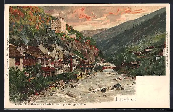 Künstler-AK Otto Strützel: Landeck, Blick über den Fluss in den Ort