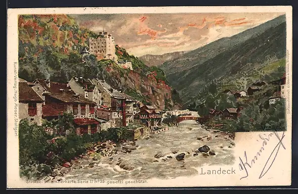 Künstler-AK Otto Strützel: Landeck, Teilansicht des Ortes mit Fluss und Brücke