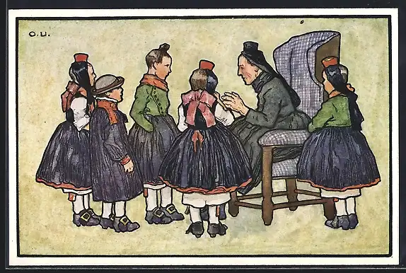 Künstler-AK Otto Ubbelohde: Grossmutter in hessischer Tracht erzählt ihren Enkelkindern etwas