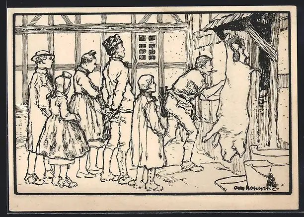 Künstler-AK Otto Ubbelohde: Hessische Trachten, Zuschauer beim Ausnehmens eines Schweines