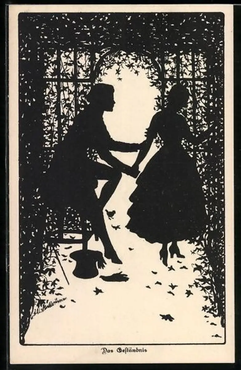 Künstler-AK Ov.Alt-Stutterheim: Das Geständnis, Mann spricht im Pavillon mit Frau, Scherenschnitt