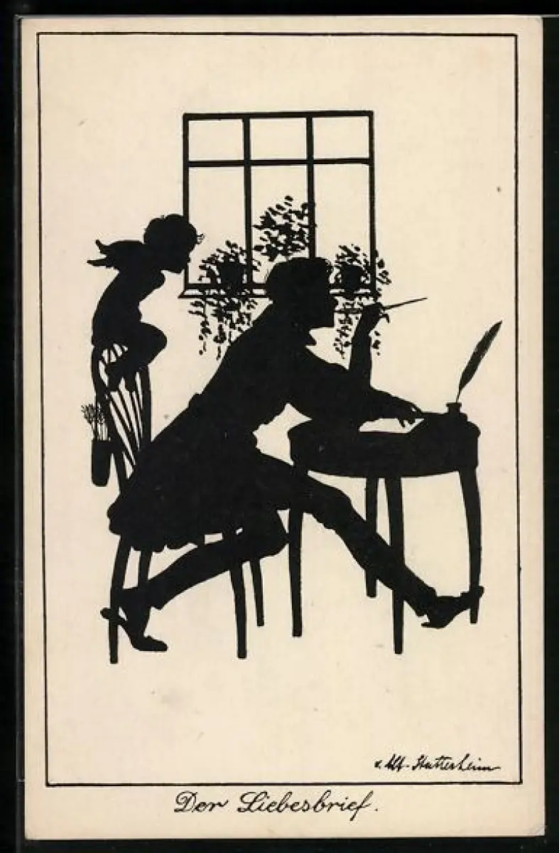Künstler-AK Ov.Alt-Stutterheim: Frau wird beim Schreiben eines Briefes von einem Engel beobachtet
