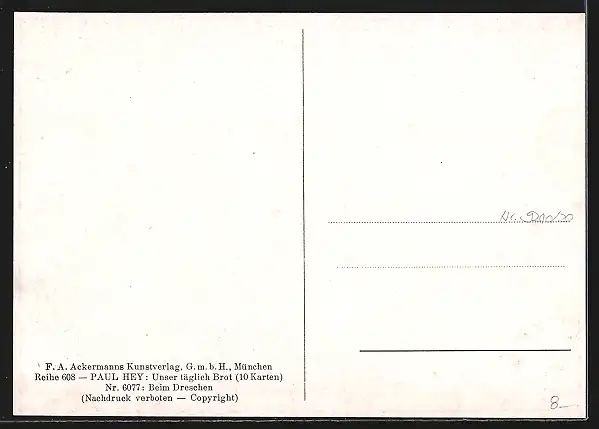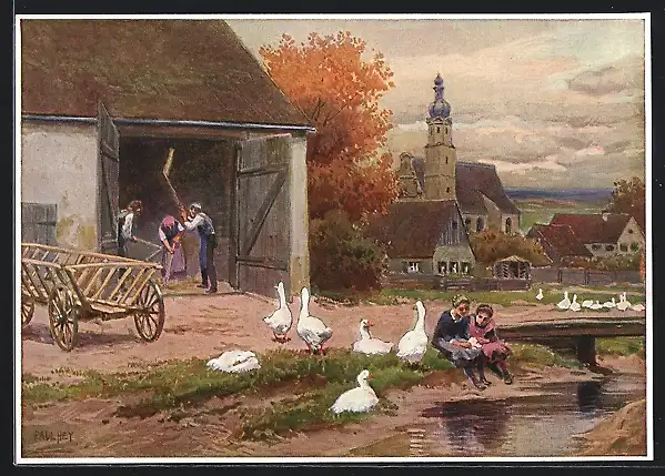 Künstler-AK P. Hey: Bauern beim Dreschen in der Scheune, Leiterwagen, Gänse