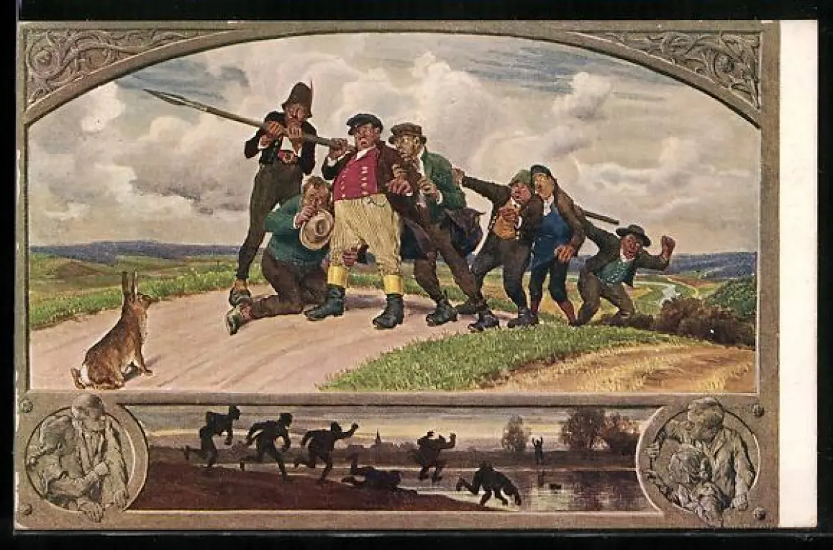Künstler-AK P. Hey: Die sieben Schwaben mit Speer haben Angst vor einem Hasen