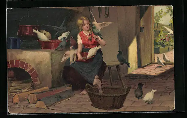 Künstler-AK P. Hey: Märchen, Aschenputtel und die Tauben sortieren die Körner