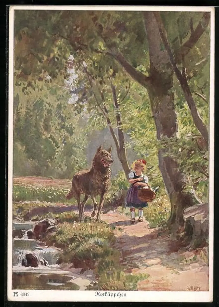 Künstler-AK P. Hey: Rotkäppchen, Begegnung mit dem Wolf im Wald, Märchen der Gebrüder Grimm