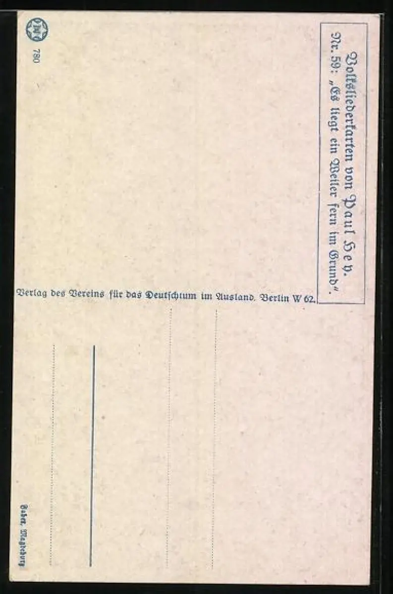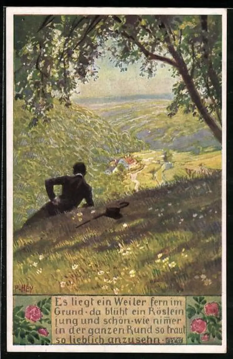 Künstler-AK P. Hey, Volksliederkarte Nr.: 59, Es liegt ein Weiler fern im Grunde