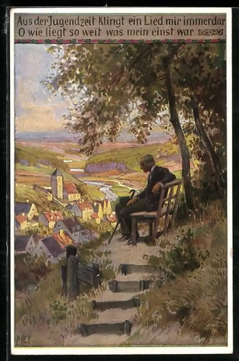 Künstler-AK P. Hey, Volksliederkarte Nr.: 69, Aus der Jugendzeit, Mann mit Stock auf einer Bank