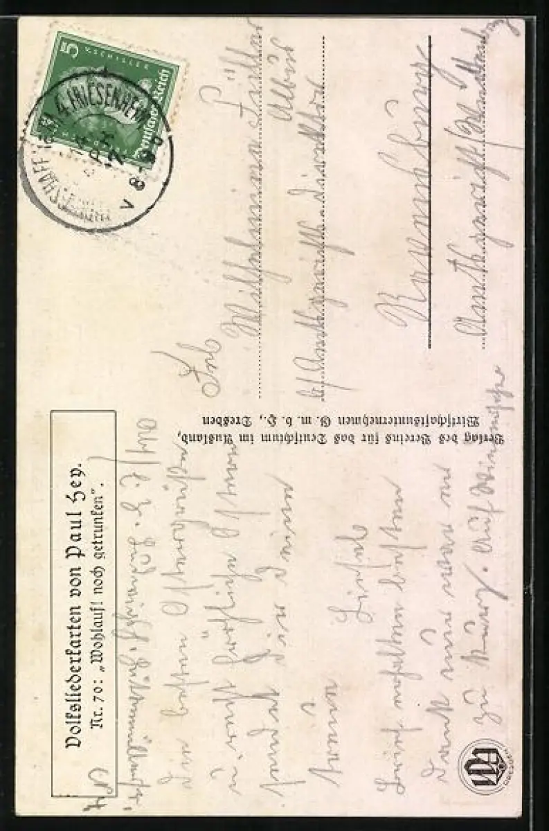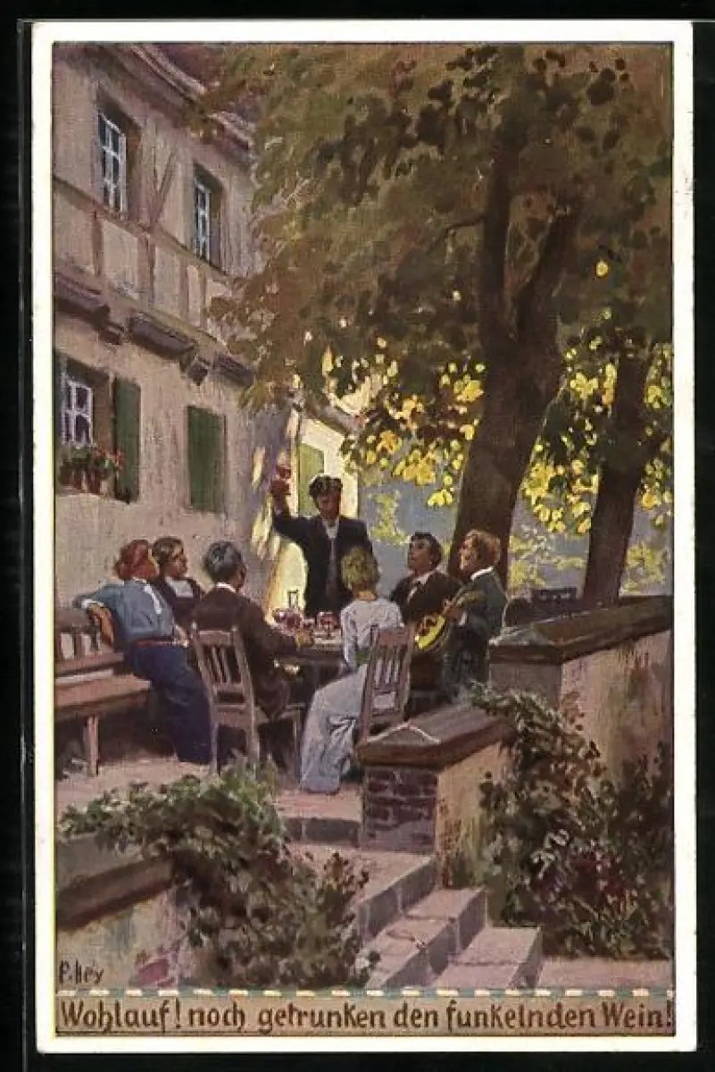 Künstler-AK P. Hey, Volksliederkarte Nr.: 70, Wohlauf, noch getrunken den funkelnden Wein