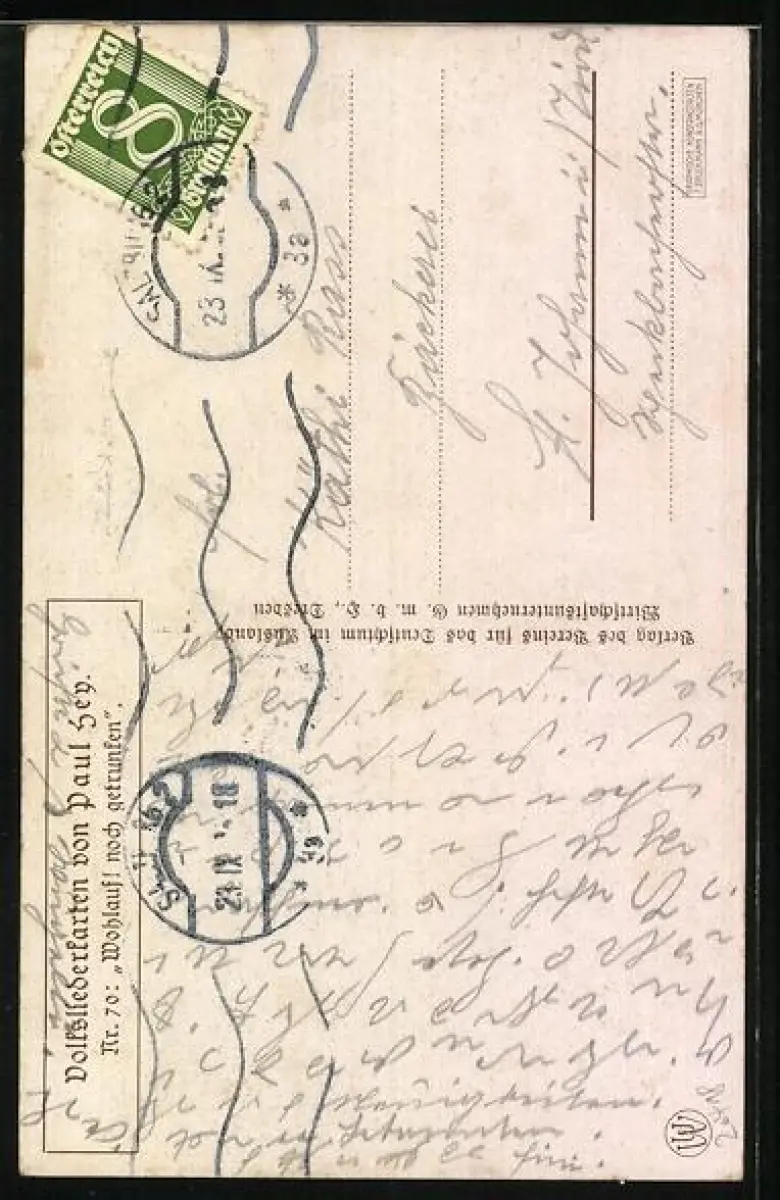 Künstler-AK P. Hey, Volksliederkarte Nr.70: Wohlauf! noch getrunken, Feiernde auf der Terrasse