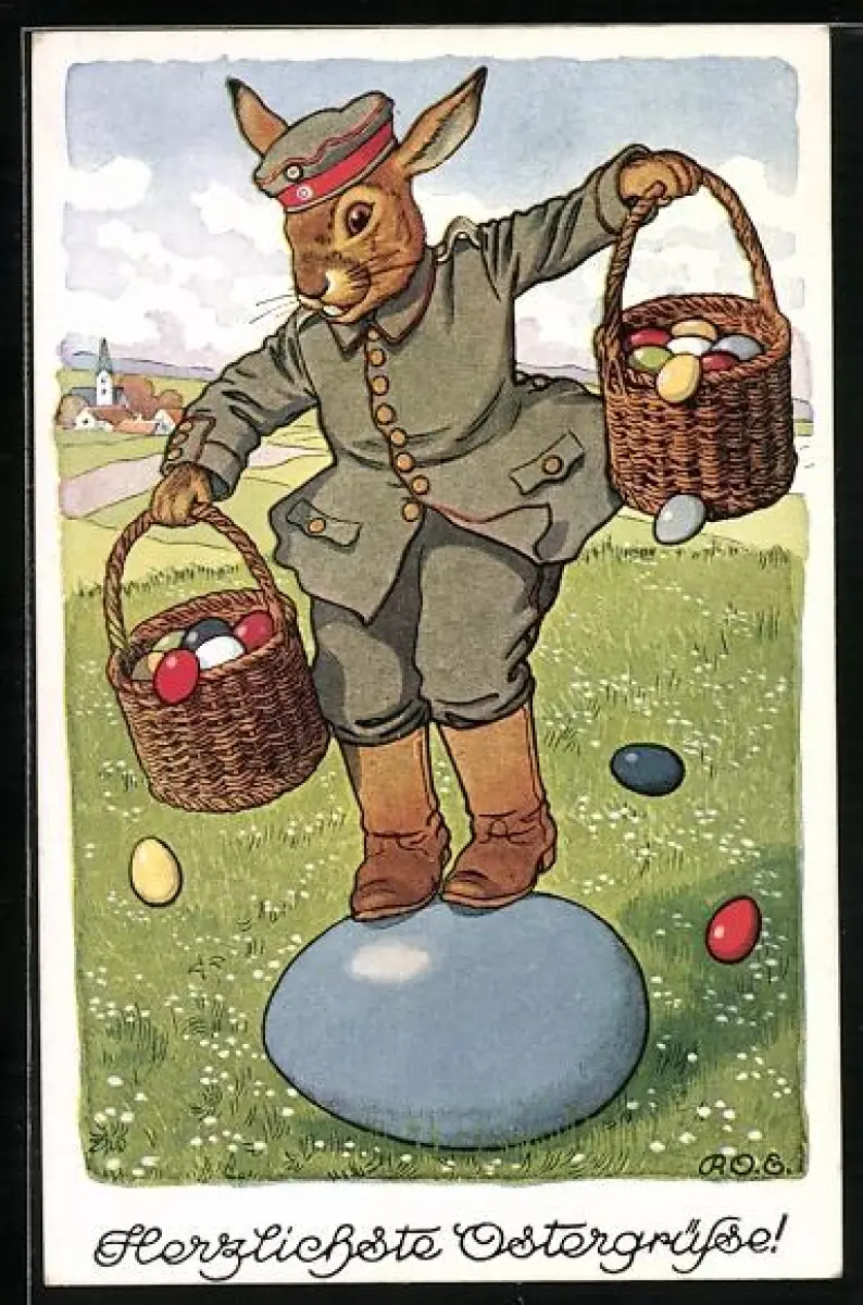 Künstler-AK P. O. Engelhard (P.O.E.): Herzlichste Ostergrüsse!, Osterhase balanciert auf einem Ei