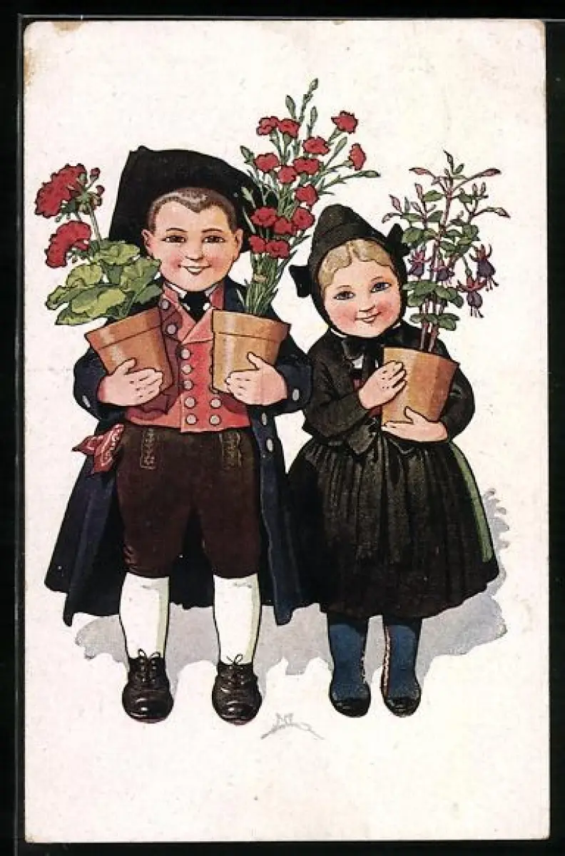 Künstler-AK P. O. Engelhard (P.O.E.): Kinder in Trachten mit Blumentöpfen