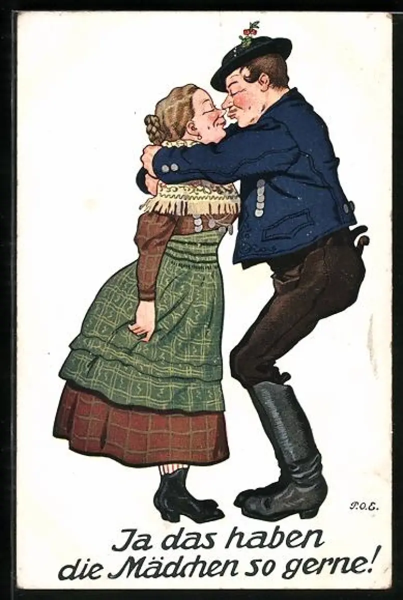 Künstler-AK P. O. Engelhard (P.O.E.): Mann umarmt eine Frau zum Kuss