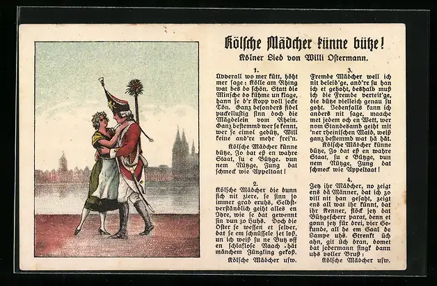 Künstler-AK Paar tanzt verkleidet zu Karneval, Liedtext Kölsche Mädcher künne bütze!