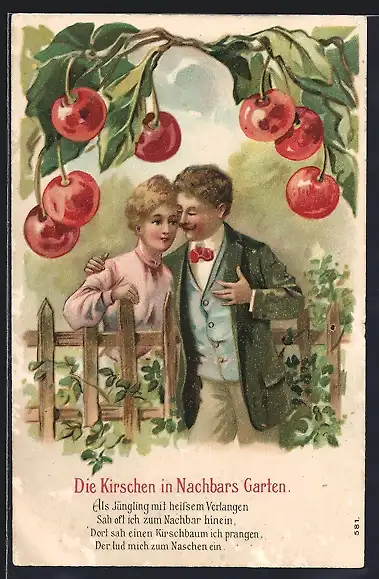Künstler-AK Paar umarmt sich unter einem Kirschbaum, Die Kirschen in Nachbars Garten