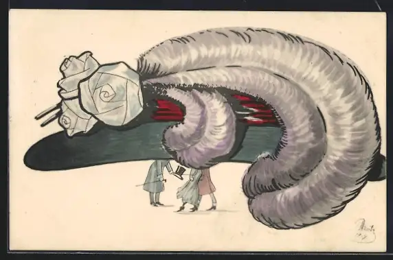Künstler-AK Pärchen und Herr mit Zylinder unter riesigem Hut