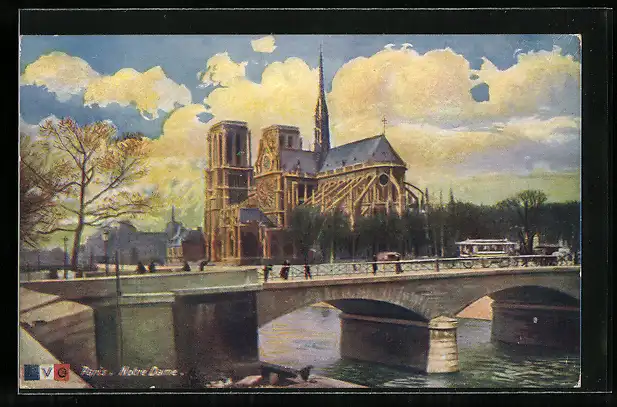 Künstler-AK Paris, Cathédrale Notre-Dame, Strassenbahn