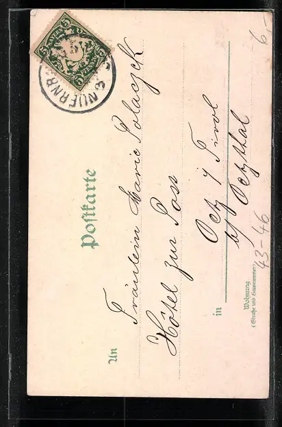 Personenbezogene Daten auf der Rückseite der Karte wurden durch blauen Textmarker unkenntlich gemacht. Die blauen Stellen sind auf die Vorderseite durchgeweicht und wirken sich negativ auf das Postkartenfoto aus