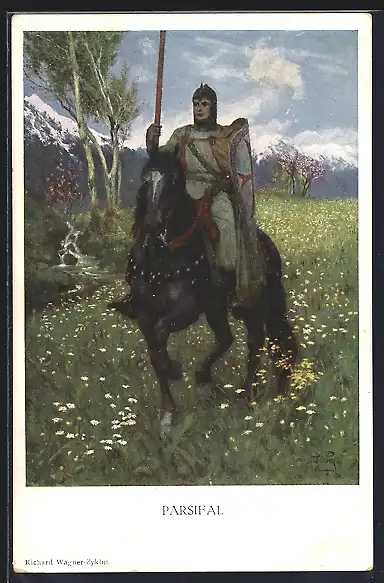 Künstler-AK Parsival in Ritterrüstung zu Pferde