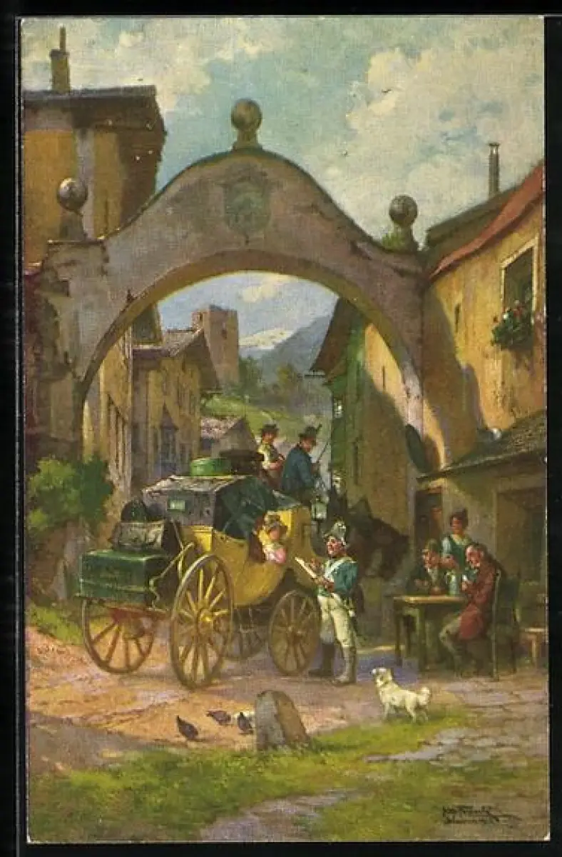 Künstler-AK Passagiere einer Postkutsche werden von einem Soldaten auf ihre Pässe kontrolliert