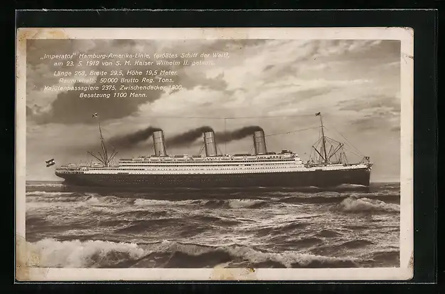 Künstler-AK Passagierschiff Imperator in voller Fahrt, Hamburg-Amerika-Linie