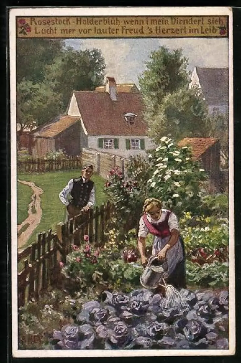 Künstler-AK Paul Hey: Frau giesst Kohl im Garten, Verein für das Deutschtum im Ausland