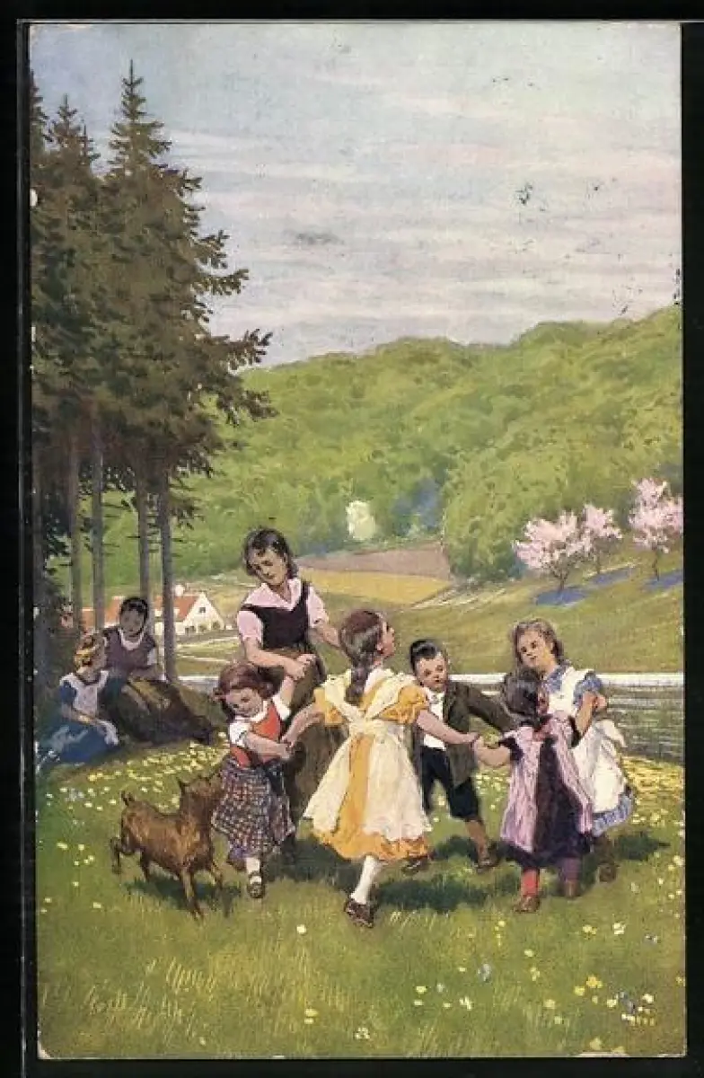 Künstler-AK Paul Hey: Kinder tanzen mit Hund auf der Wiese