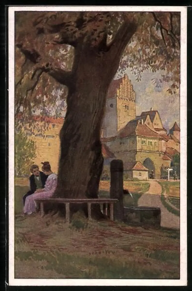 Künstler-AK Paul Hey: Paar auf einer Bank, Verein für das Deutschtum im Ausland