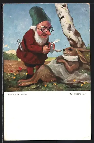 Künstler-AK Paul Lothar Müller: Der Hasendoktor, Zwerg gibt einem Hasen Medizin