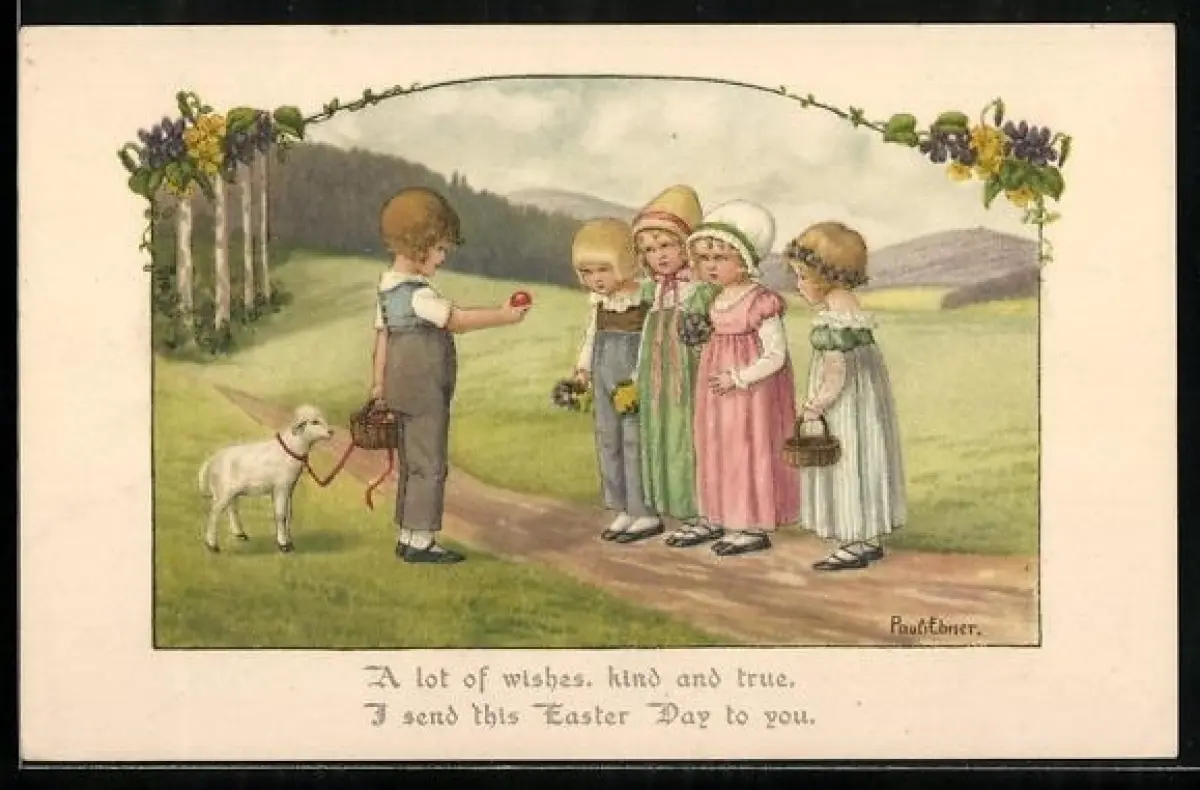 Künstler-AK Pauli Ebner: Junge mit Osterei und Lamm, Ostergruss