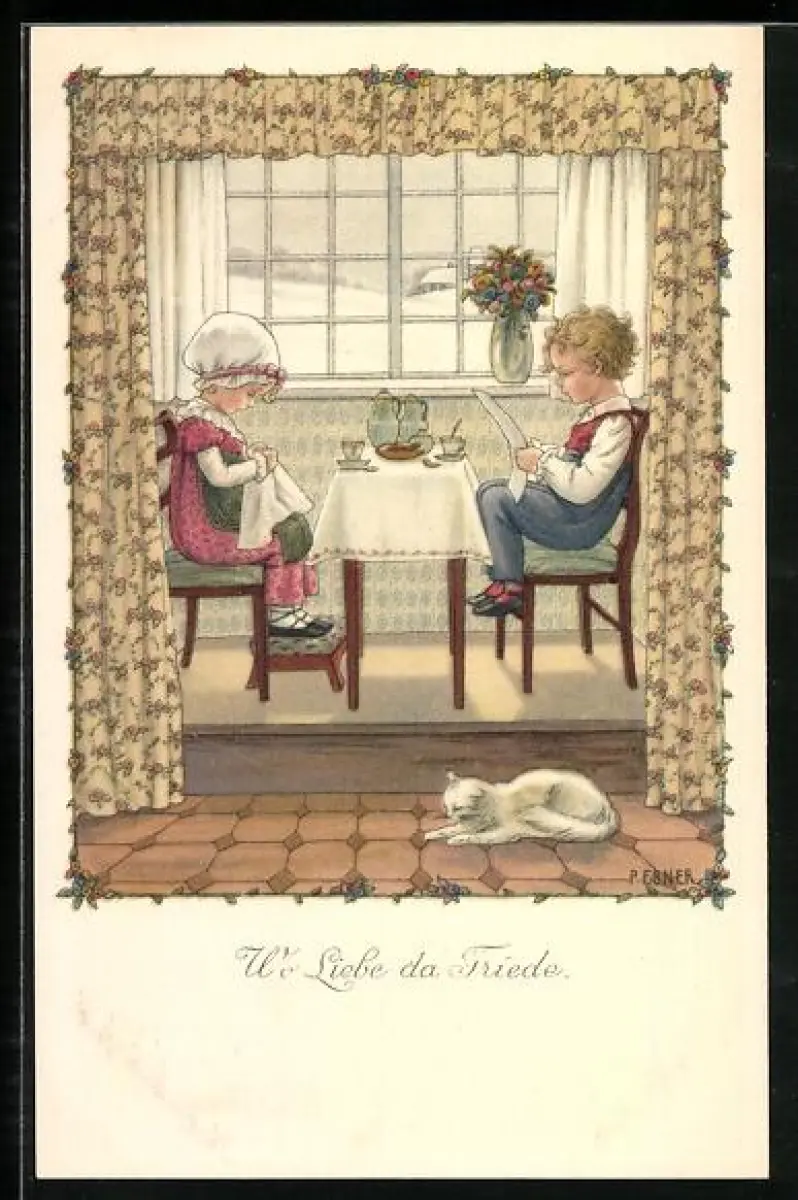 Künstler-AK Pauli Ebner: Kinder am Kaffeetisch mit Katze