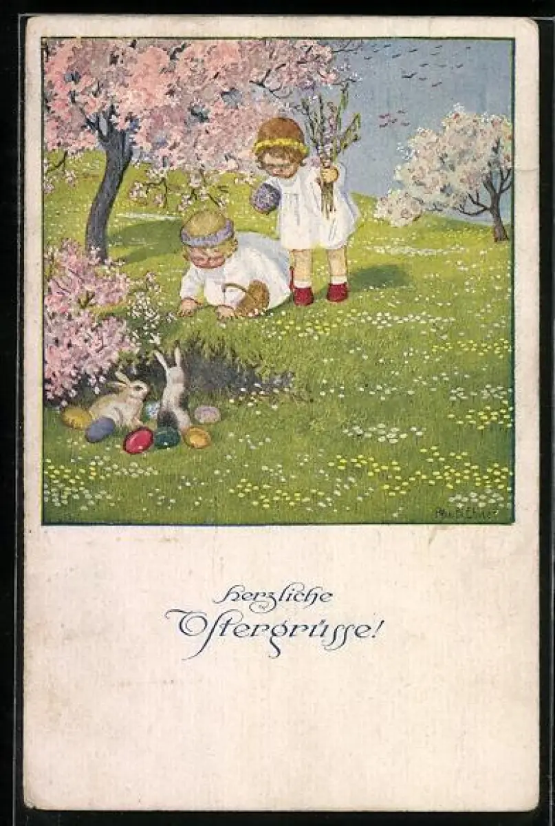 Künstler-AK Pauli Ebner: Kinder suchen Ostereier, Ostergruss