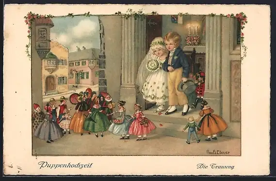 Künstler-AK Pauli Ebner: Puppen erwarten das junge Hochzeitspaar vor der Kirche