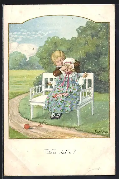 Künstler-AK Pauli Ebner: Wer ist`s?, Junge hält Mädchen die Augen zu