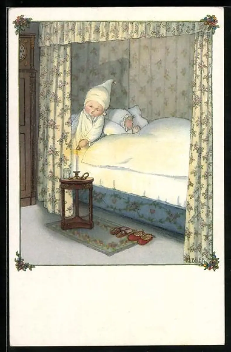 Künstler-AK Pauli Ebner: zwei Kinder begeben sich zu Bett & löschen das Licht