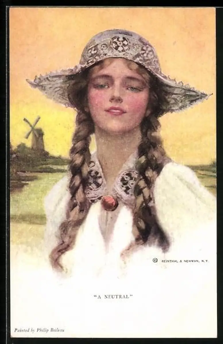 Künstler-AK Philip Boileau: A Neutral, junge Frau mit Hut vor einer Windmühle