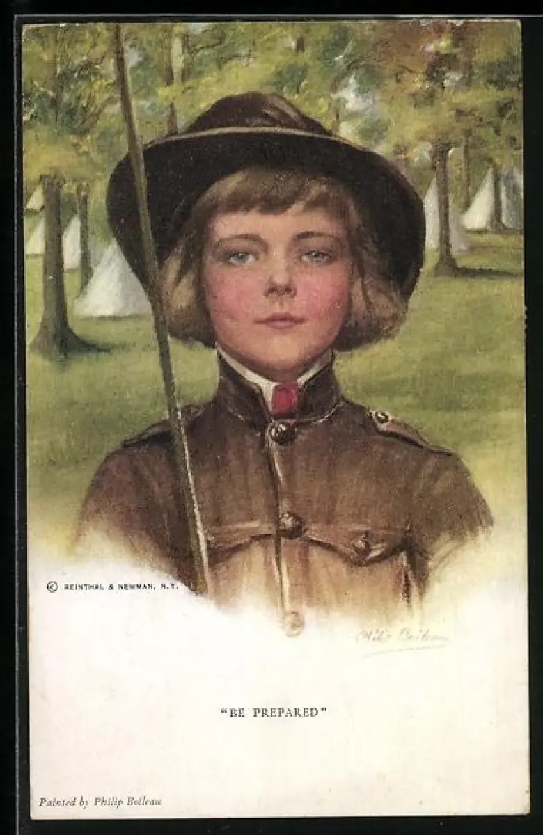 Künstler-AK Philip Boileau: Be prepared. Sei bereit. Mädchen in Uniform vor Zelten