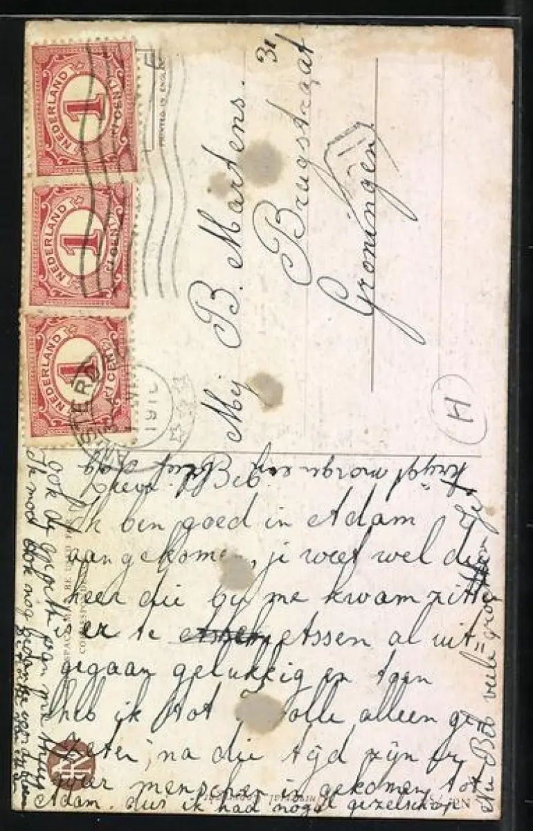 Personenbezogene Daten auf der Rückseite der Karte wurden durch blauen Textmarker unkenntlich gemacht. Die blauen Stellen sind auf die Vorderseite durchgeweicht und wirken sich negativ auf das Postkartenfoto aus