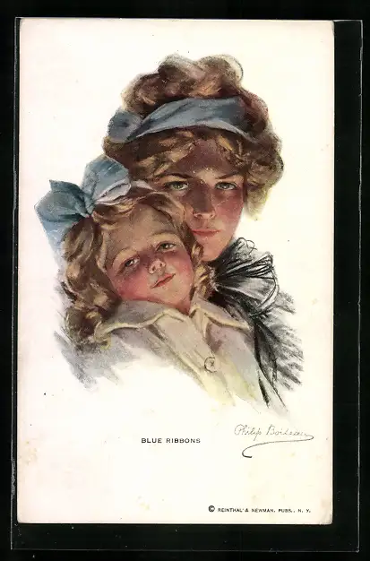 Künstler-AK Philip Boileau: Blue Ribbons, Blaue Bänder, eine junge Mutter hält ihre Tochter im Arm