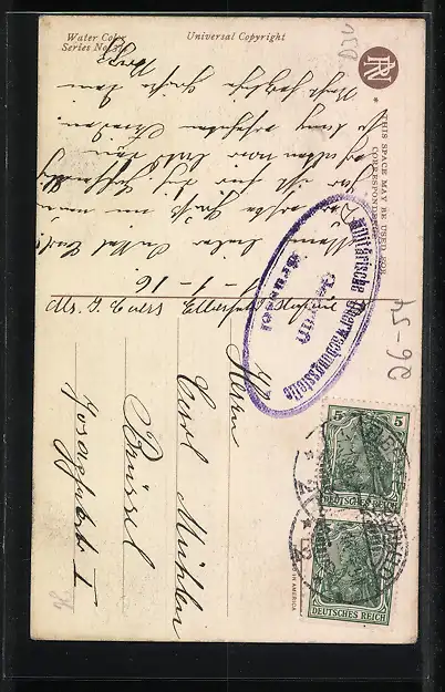 Personenbezogene Daten auf der Rückseite der Karte wurden durch blauen Textmarker unkenntlich gemacht. Die blauen Stellen sind auf die Vorderseite durchgeweicht und wirken sich negativ auf das Postkartenfoto aus