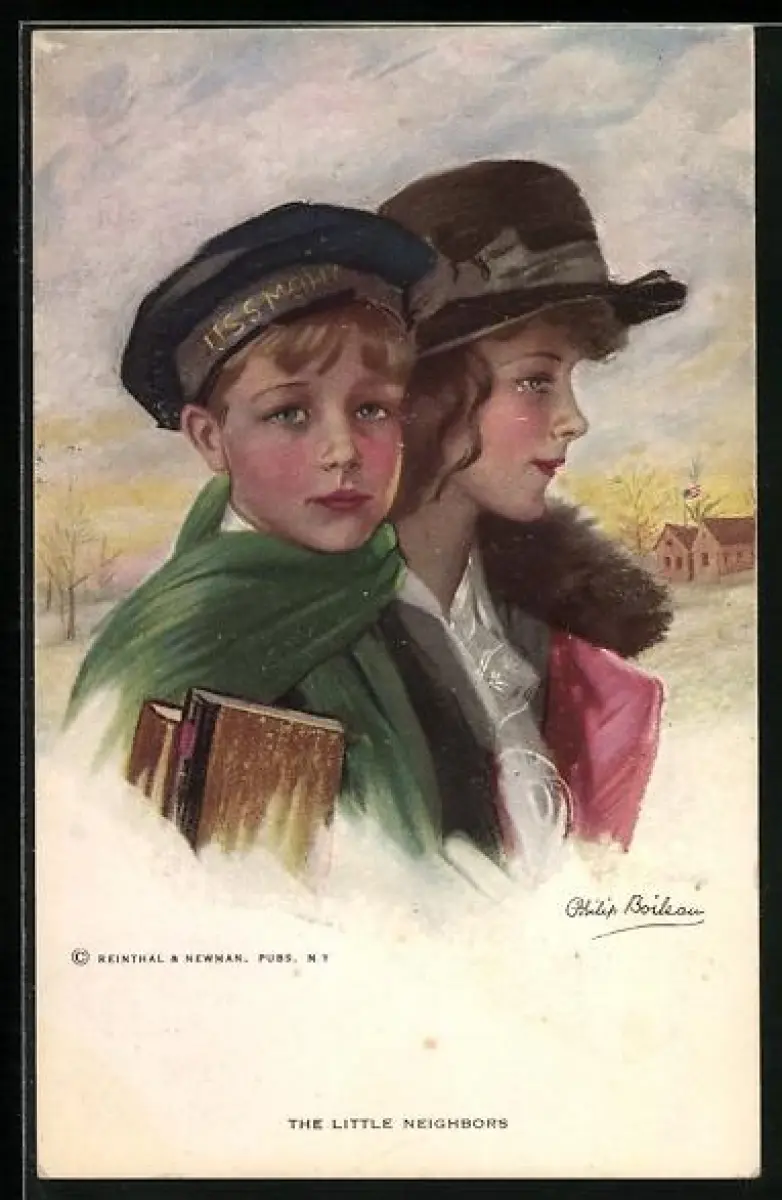 Künstler-AK Philip Boileau: Junge mit Büchern unter dem Arm mit seiner Freundin
