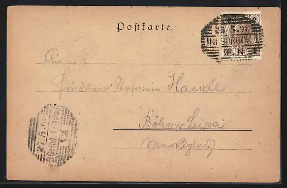 alte Ansichtskarte, gelaufen 1898, Eckknick oben li., Abriebspuren unten re., guter Zustand