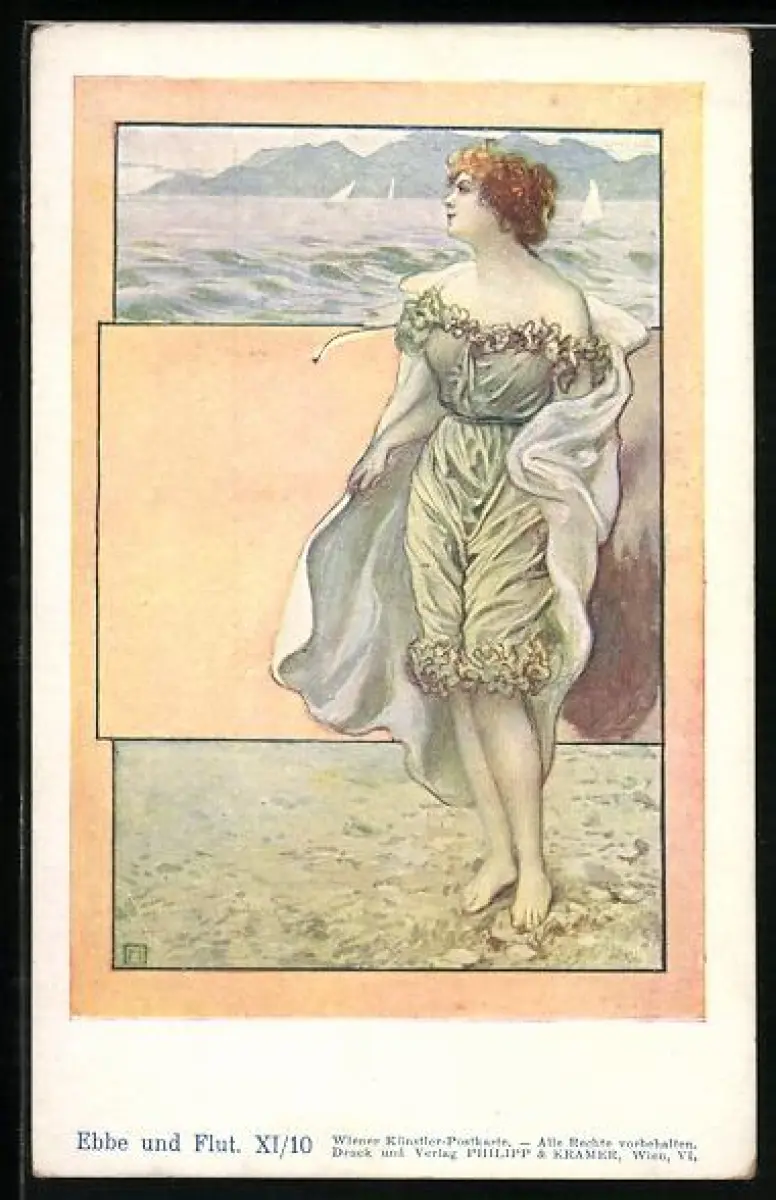 Künstler-AK Philipp + Kramer Nr. XI /10: Ebbe und Flut, Junge Frau im Badeanzug schaut aufs Meer