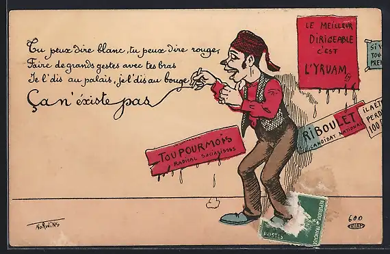 Künstler-AK Philippe Norwins: Tu peux dire blanc..., Mann schreibt an Hauswand