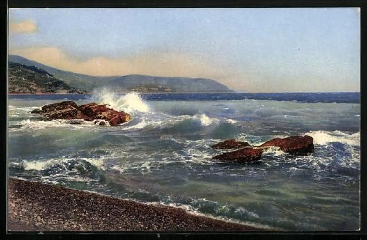 Künstler-AK Photochromie Nr. 2641: Riviera di Ponente, Bordighera, Felsen in der Brandung