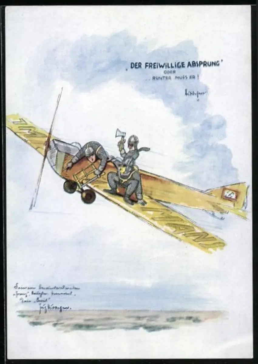 Künstler-AK Pilot sägt an der Tragfläche eines Flugzeugs